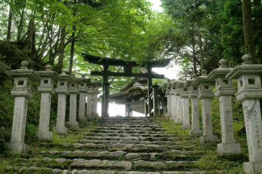 随身門を潜り、三峯燈籠が並ぶ路を下る。 |