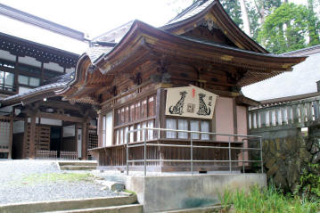 拝殿の奥にある本殿。寛文元年(1661)11月、中興第六代龍誉法印が、願主となって造営した一間社春日造りの建物。石積みの基壇上に立ち、正面と両側に縁を回し、公欄を付け、屋根は銅板葺きで、総体的に木割が太く堂々とした風格を備えている。 |